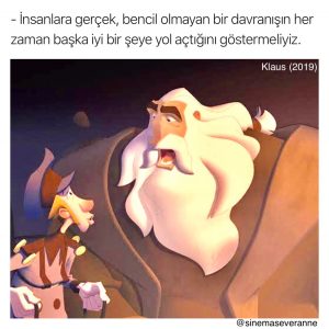 Filmin mesajı “İyilik yap iyilik bul”dur. Filmlerde çokça gördüğümüz bu mesajı Klaus’ta beğenme sebebim senaryonun başarısı, karakterlerin karikatürize edilmeden yazılması, çizim tekniğinin sadeliğine rağmen etkisi, ışık kullanımının mükemmelliği ve kesinlikle dublajın beni mest etmesidir! Evet, bu Netflix animasyonunu kesinlikle dublajlı izleyin çünkü bu konuda çok iyiyiz, hem de çok! Hele Serra Yılmaz ve Yekta Kopan’ın sesini duymak aşırı mutlu etti beni! Karakter sayısının fazlalığına rağmen ana konunun hiç sekteye uğramaması, müzikleri de animasyona ayrı bir heyecan katıyor.